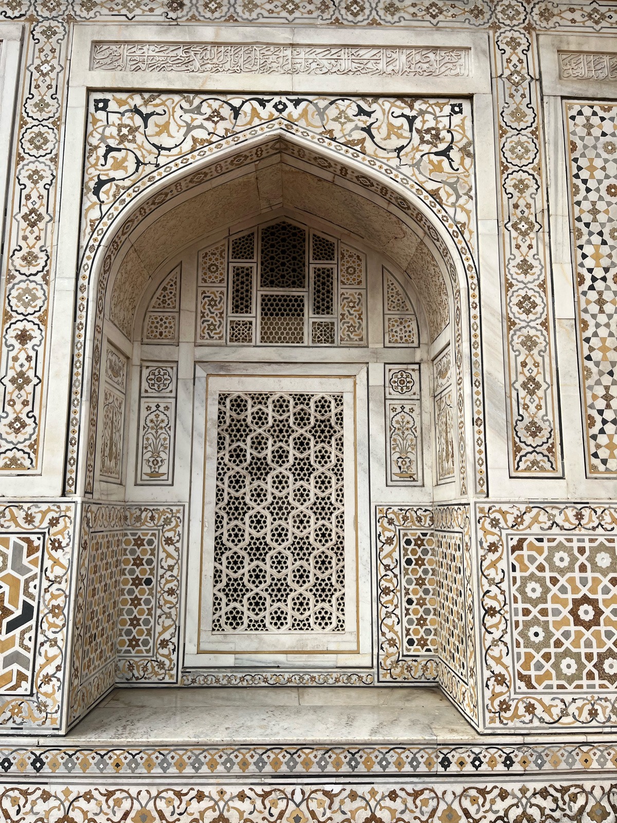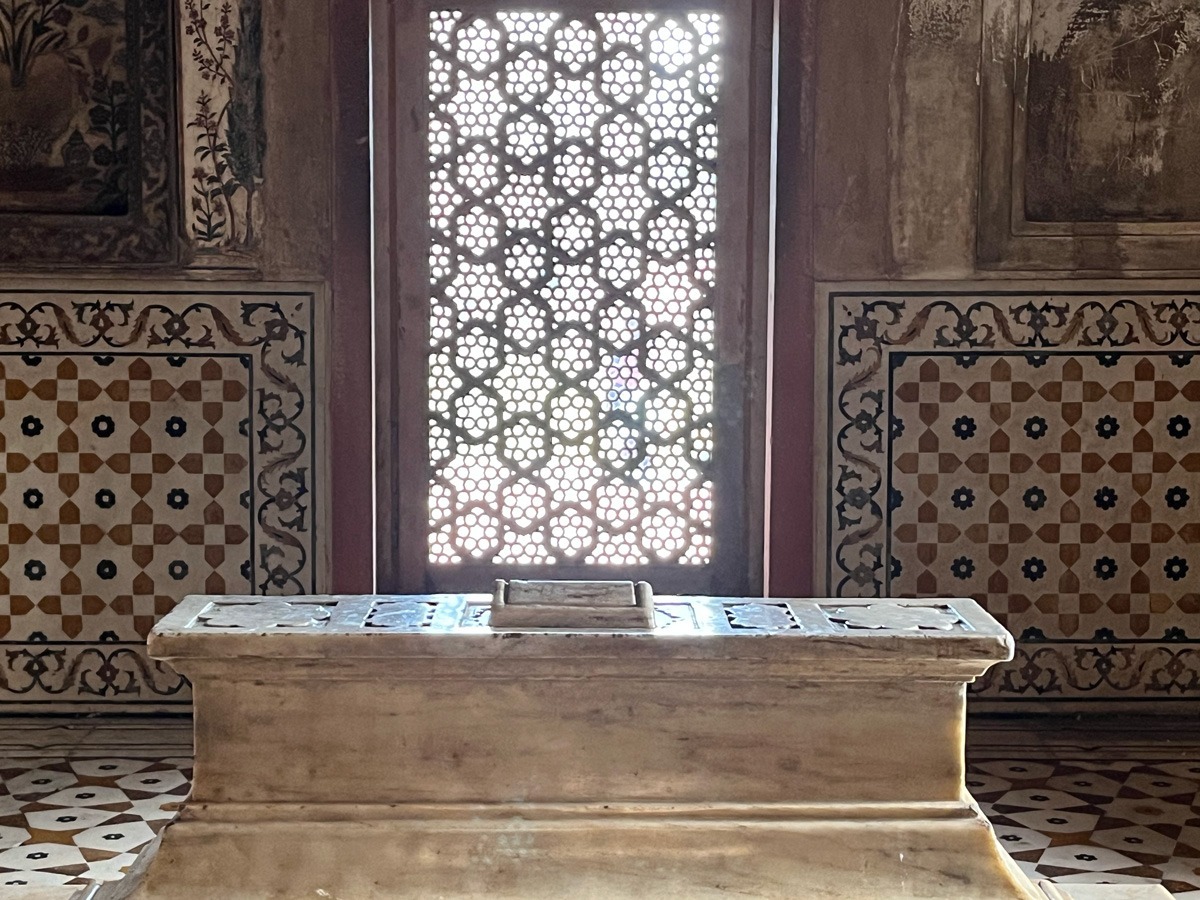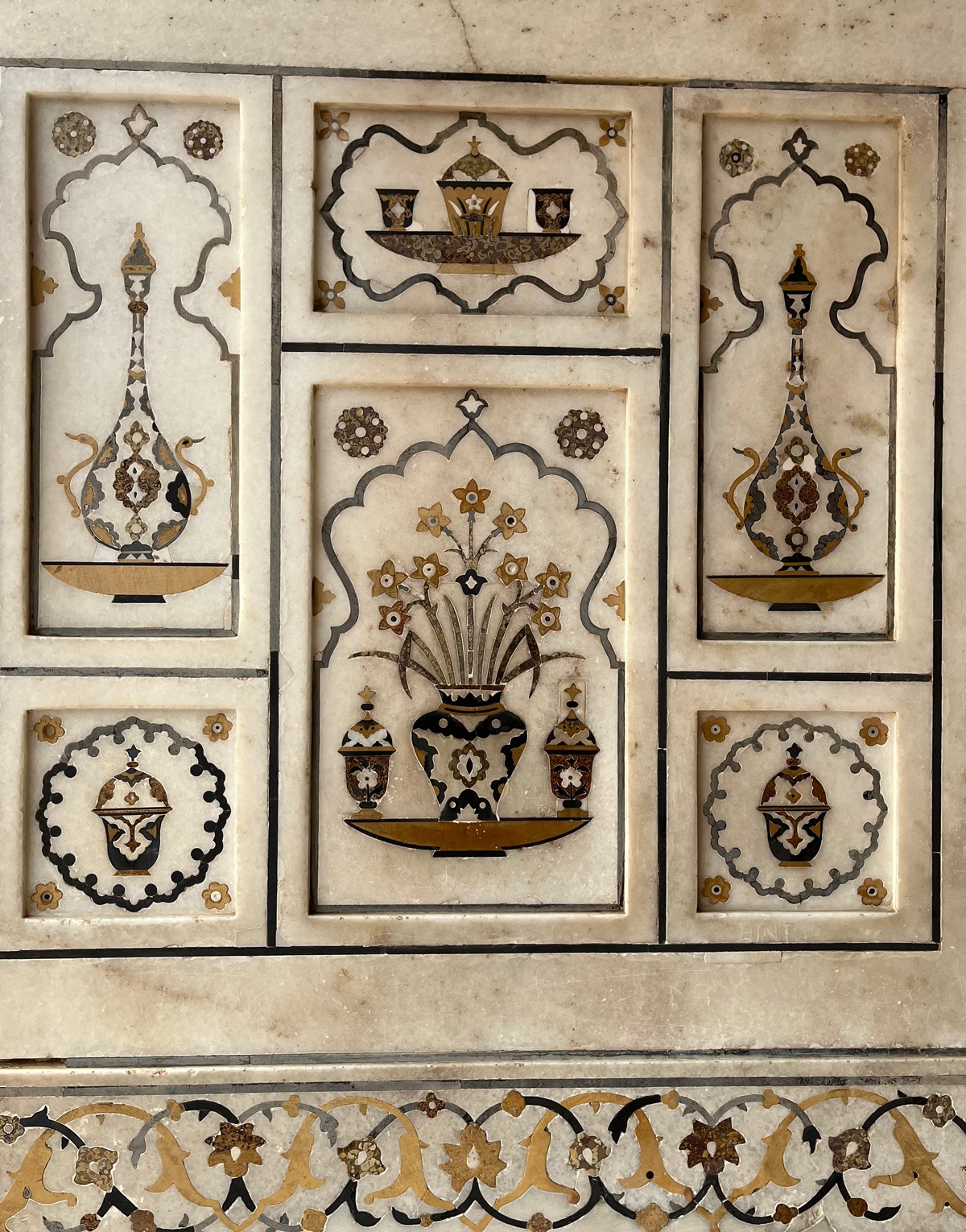 The tomb is at the centre of the garden, its ornamentation breath-taking. Every inch is covered in fine stone-inlay Pietra dura work, also called prachin kaari. The inlay work is in jasper, lapus lazuli, onyx, topaz. There are Persian-inspired wine vessels, fruits trays with grapes and pomegranates, water ewers, cypress trees, honeysuckle, lotus. Even the floors have stone inlay work in striking geometric patterns. Light and air is filtered in through exquisitely carved jaali panels, like “embroidery work done in ivory”.