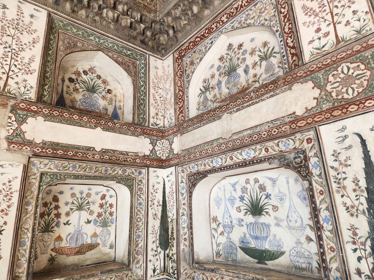 Visitors would alight at a double-storeyed pleasure pavilion, which served as the main entry gate and overlooked the river. There are plenty of interesting features on its façade; the famous chini khana design – that embellish the walls of so many Mughal monuments – small niches carved in the walls and used for displaying decorative objects, often Chinese porcelain (hence the name). Frescoes of floral patterns on the walls and ceiling, along with the surprising use of the wine-vase and dish-and-cup designs.