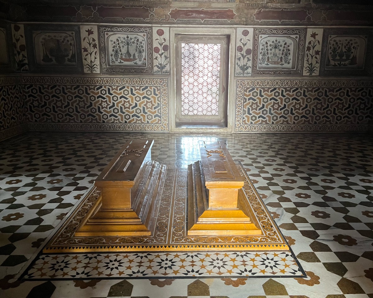 In the center are the caramel-colored graves of Mirza Ghiyas and Asmat Begum, resting in quiet elegance.
