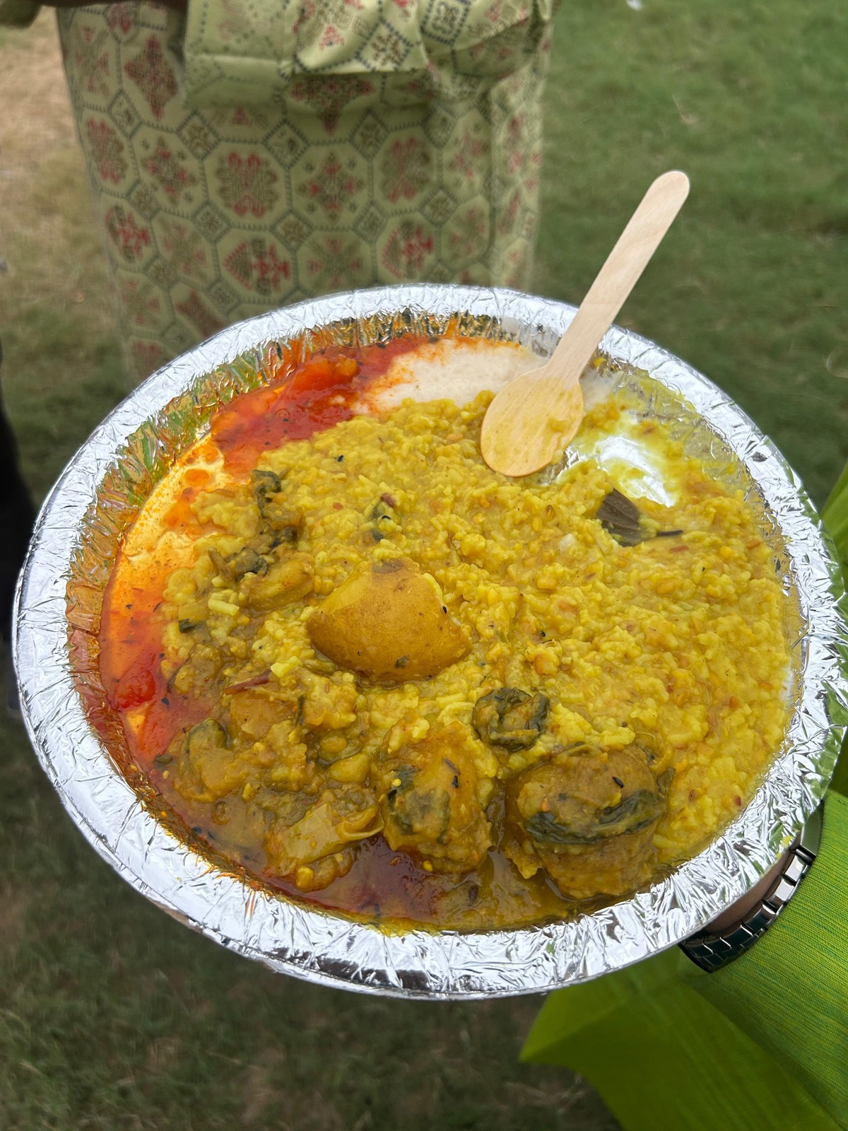 The true soul of the celebration lies in its simplicity in the bhog. On afternoons of Saptami, Ashtami and Navami, long queues snake outside the pandals as devotees wait patiently for the sacred meal. Khichuri, labra, chutney, papad, and payesh are served. The food is humble, but eaten in community, it feels divine. I recall one sweltering October afternoon when, exhausted from waiting in line, I was offered a steel tumbler of water by a complete stranger. We ended up sharing the bhogside by side. The food tasted like nectar, not because of its richness, but because it was shared. That is Pujo, strangers becoming family, the act of eating together dissolving all boundaries.
